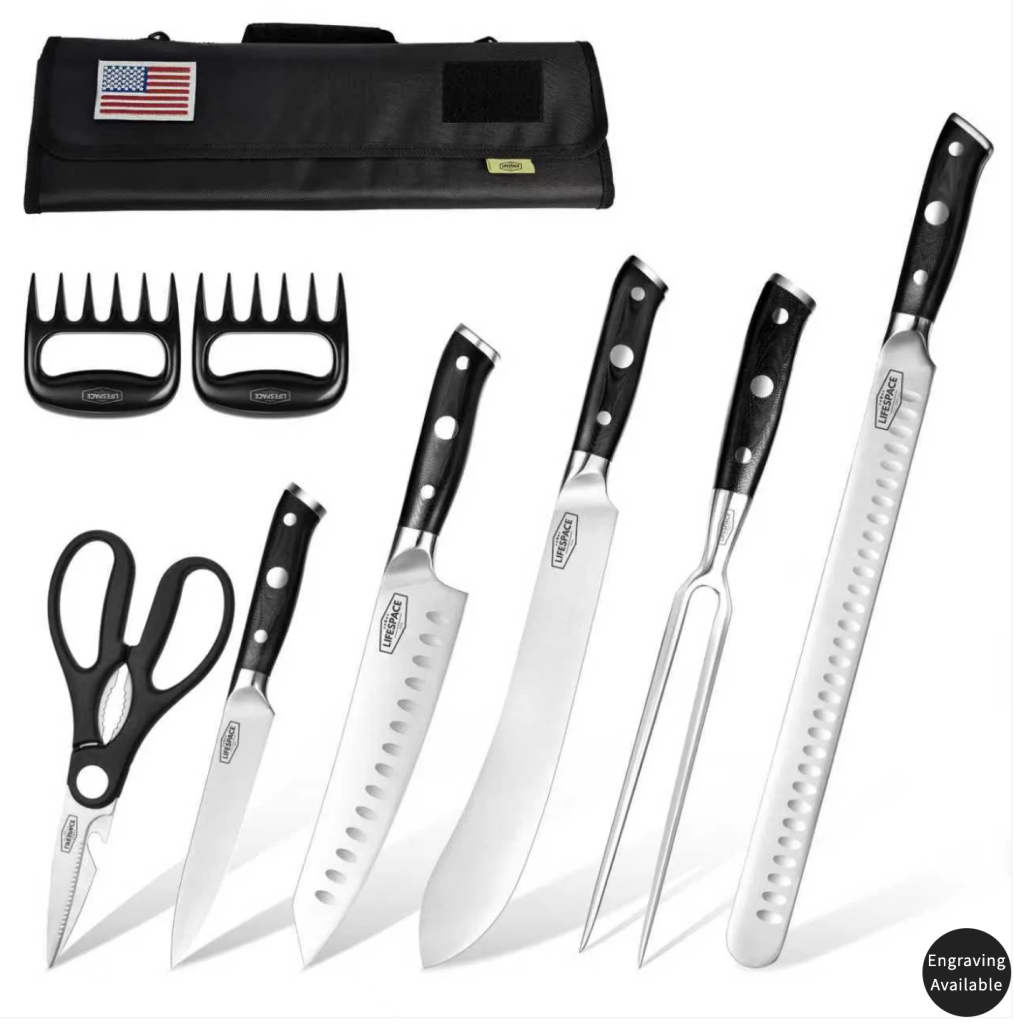 If you’re building a serious knife kit for the kitchen or backyard smoker, this 9-piece set from Lifespace brings solid bang for your buck. The lineup covers all the basics — utility, chef, slaughter and brisket knives, plus scissors, meat claws and a carving fork — so you’re ready for everything from trimming brisket to dicing veggies. Engraving is also available from LifeSpace on each knife they sell, making this set an excellent option for gifts, teams, or personalized use. Each blade is made from German 1.4116 stainless steel, which is known for holding a sharp edge and resisting corrosion during heavy use. G10 handles give a balanced, confident grip even when things get messy. The included roll makes transport and storage easy, perfect for catering, competition BBQ, or just keeping your gear organized at home. FDA-approved and food-safe, this set feels built for real cooks at a very friendly price point around ~$99 — a great value compared to standalone pro knives.